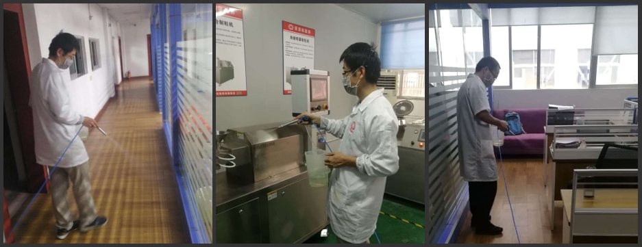 安全生產,大家的健康是第一位,我們采取了一系列的防疫舉措,首先是全面消毒,涉及廠區的每個角落;其次是安排專人測量出入廠區人員體溫;會議采取網絡語音或視頻進行;就餐實行分批次分散就餐。